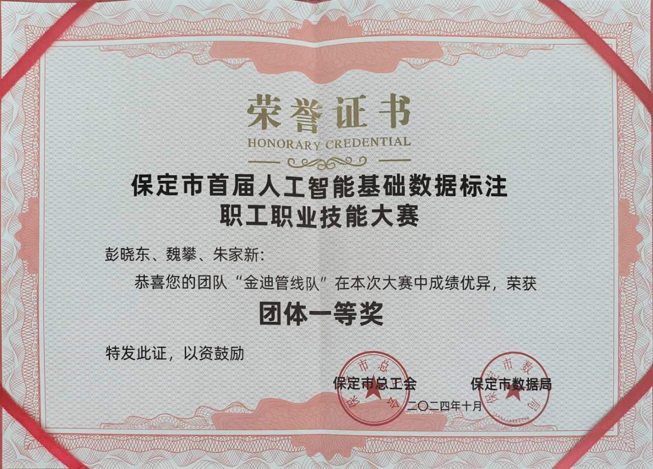 榮譽|金迪榮獲保定市首屆人工智能基礎數據標注職工職業技能大賽團體一等獎