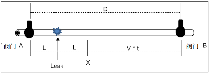 漏水發生時,漏水聲波同時向閥門A和B兩個方向傳播。當漏水噪聲到達A點時,向B點傳播的噪聲剛剛到達X點,因而,聲波到達B點的時間就比到達A點的時間晚了,聲波通過X點和B點之間管段時產生了延遲時間,相關儀可以檢測到噪聲傳播到A點和B點的延遲時間。
