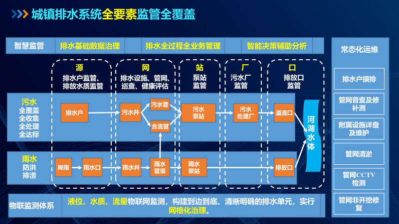 智慧化監管,打造貼合管理需求的應用場景。圍繞污水提質增效目標和防汛應急業務痛點,平戰結合,打造涵蓋排水全要素、全業務管理的“源、網、站、廠、口”監管體系,構建管網、泵站、污水處理廠、巡檢養護在內的全局管控“一平臺”,滿足日常管理、提質增效、災情預判、防汛調度、應急搶險等功能需要,實現排水管理高效化,提質增效精準化。