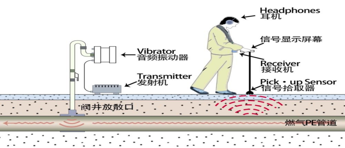 的工作原理出發,通過人為給被測的燃氣PE管道施加一個特定頻率的聲波信號,用它來探測燃氣PE管管線。根據地球物理勘探行業的命名規則,他們將這種方法命名為主動聲源探測法,以此來區別自然聲場法和聲波反射法。
