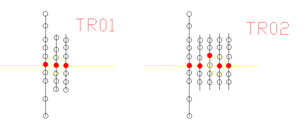 度。許多初次使用PE探管儀的技術人員,經常使用單個探測剖面來確定管道的位置,由于管道上面不均勻的土壤等介質會導致聲波在地面上的信號有不同程度的偏移,探測單個剖面往往會導致管道定位誤差大。為了提高探測精度,滿足相關規范要求,我們需要在定點處采用多個剖面進行探測。如下圖所示。比如我們需要確定 TR01 這個探測點,那至少需要探測三個剖面,如果三個剖面的最強值均(下圖中紅色點)位于一條線上,那么三個強值點連線即為管道的水平位置;如果個別剖面強點不在一條線上,那么應該在管道走向的前后繼續探測,使得大多數點連線位于一條直線上,那么這個探測結果就比較可靠,如 TR02 點。